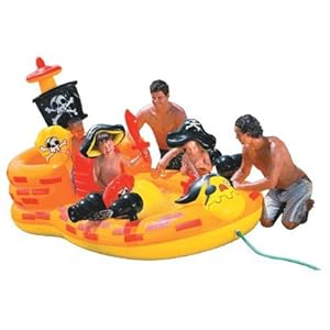 This pirate hideout playcenter by Intex has the following features: This pirate pool by Intex is a large pool. It's size is 305 x 152 x 163cm. The pool is made of vinyl and has multiple air chambers. This playcenter has many play opportunities. Waterslide Water sprinklers Cannon balls Inflatable treasure-chest Two inflatable shields, swords and hats Two cannons that can really fire! (includes ammunition) Wading pool Including repair patches The sprinklers can easily be attached to the garden hose during hot summer days. In short, this pirate pool is great for all those real pirates out there!